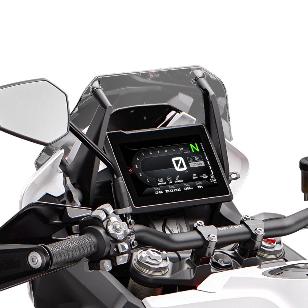 Una parte crítica de tus aventuras es, posiblemente, la presión de tus neumáticos. Afortunadamente, la KTM 1290 SUPER ADVENTURE R está equipada con un sistema TPMS (Sistema de Control de la Presión de los Neumáticos) que lee la presión de ambos neumáticos y traseros y la muestra en la pantalla TFT para una fácil visualización. En caso de cualquier pérdida de presión, aparecerá un aviso en la instrumentación.