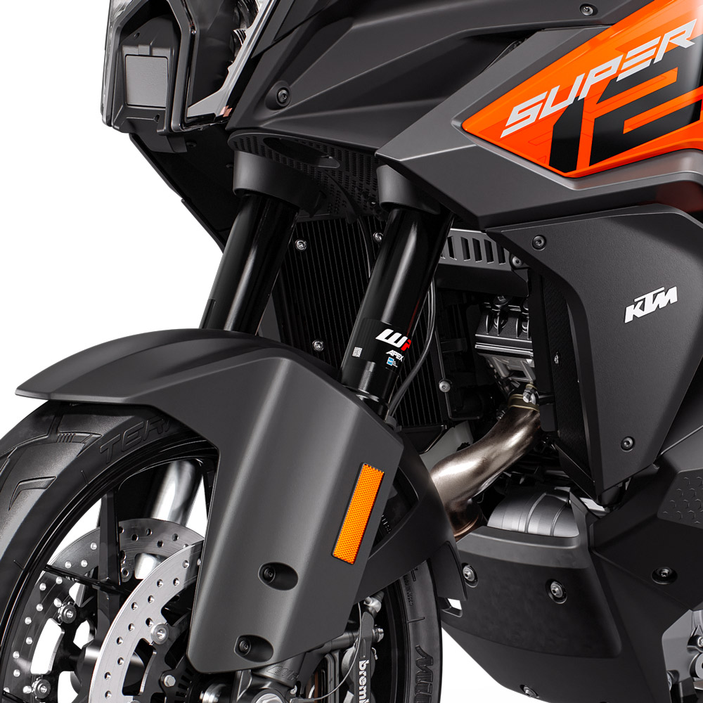 La KTM 1290 SUPER ADVENTURE S cuenta ahora con dos radiadores separados en lugar de uno en una sola pieza. El resultado es una mejor disipación del calor, y una mejor refrigeración del motor en todos los sentidos. Unos conductos de aire ingeniosamente diseñados ahora también envían aire frío hacia el motor, no sólo manteniendo fresca la moto, sino también las piernas del piloto.