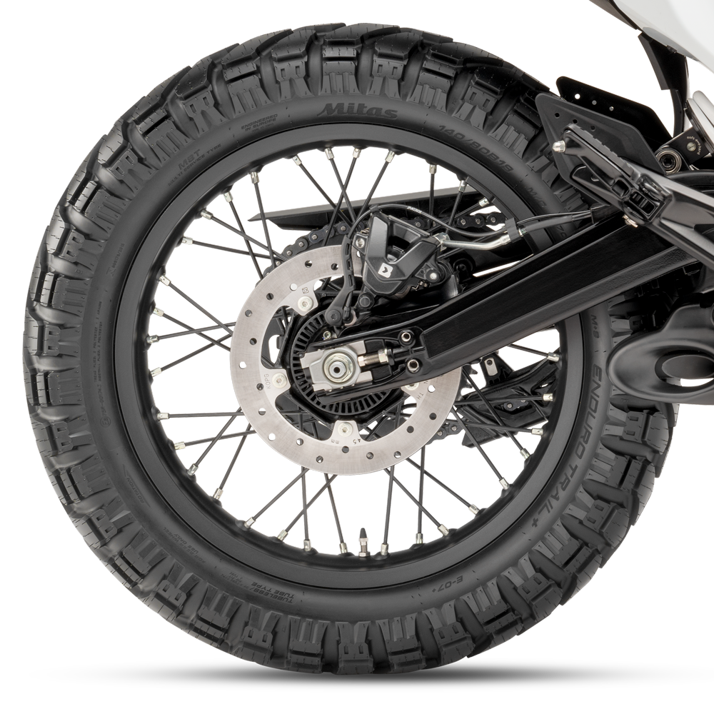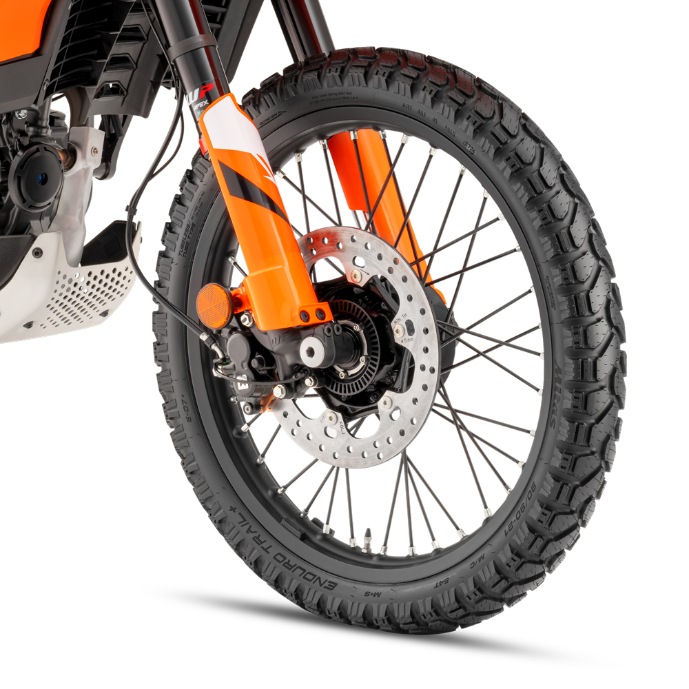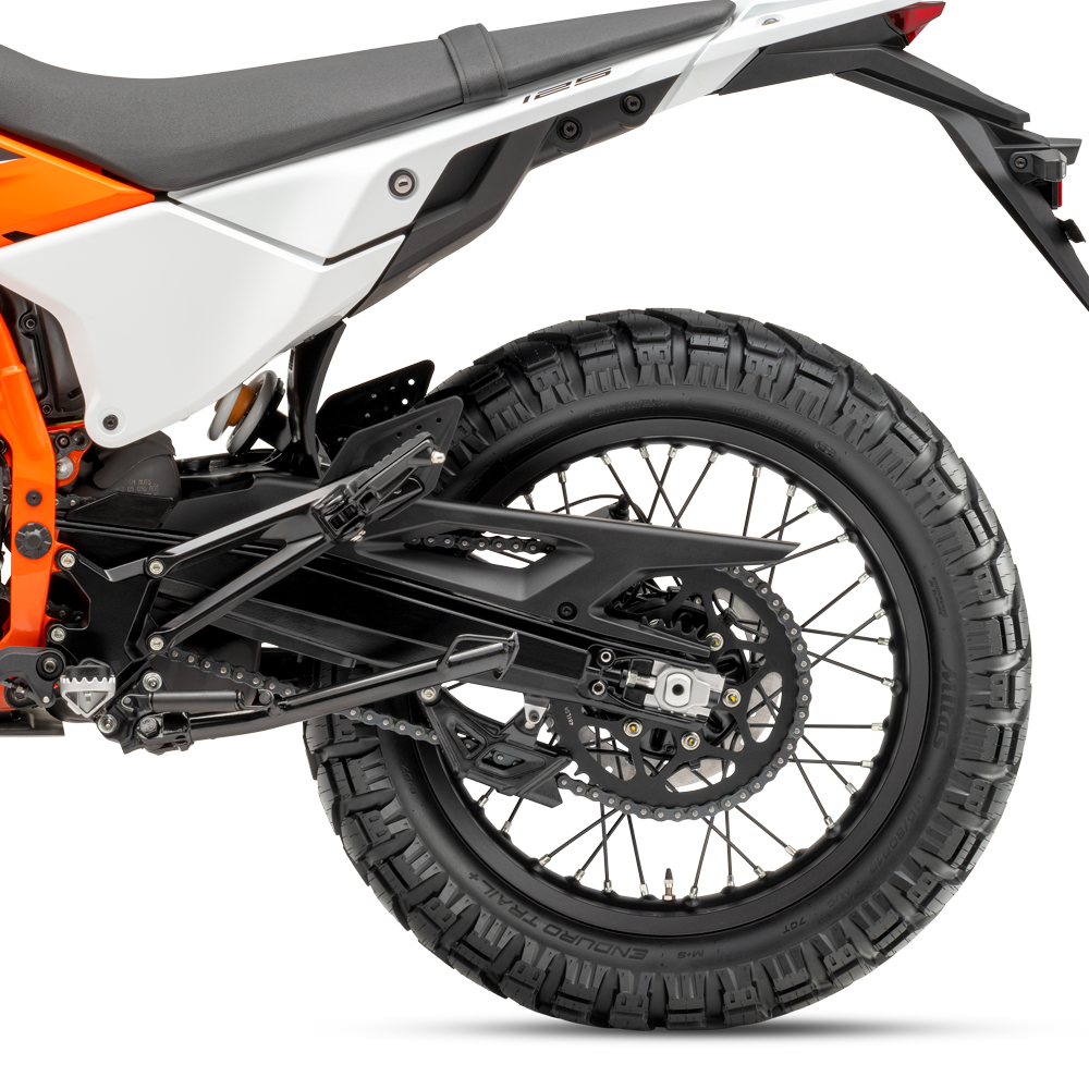 Acentuando su innegable carácter offroad, la KTM 125 ENDURO R cuenta con llantas de radios de 21″ delante y 18″ detrás.