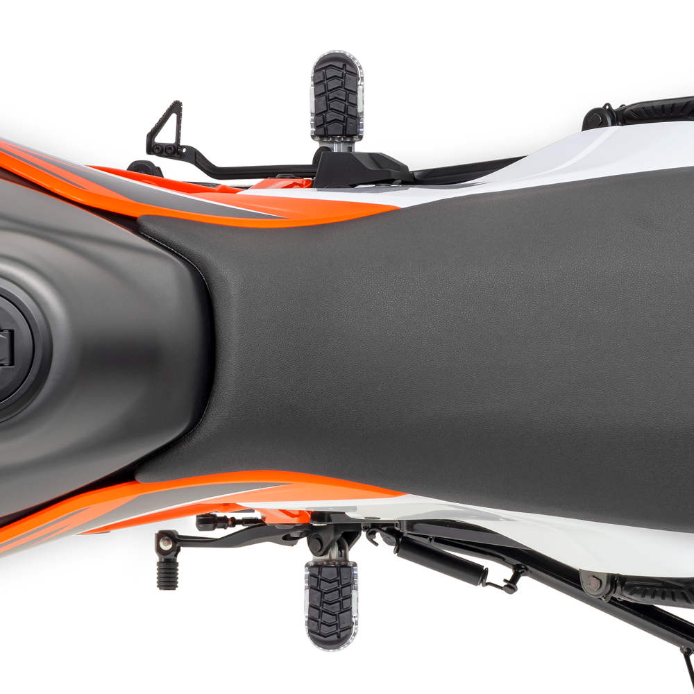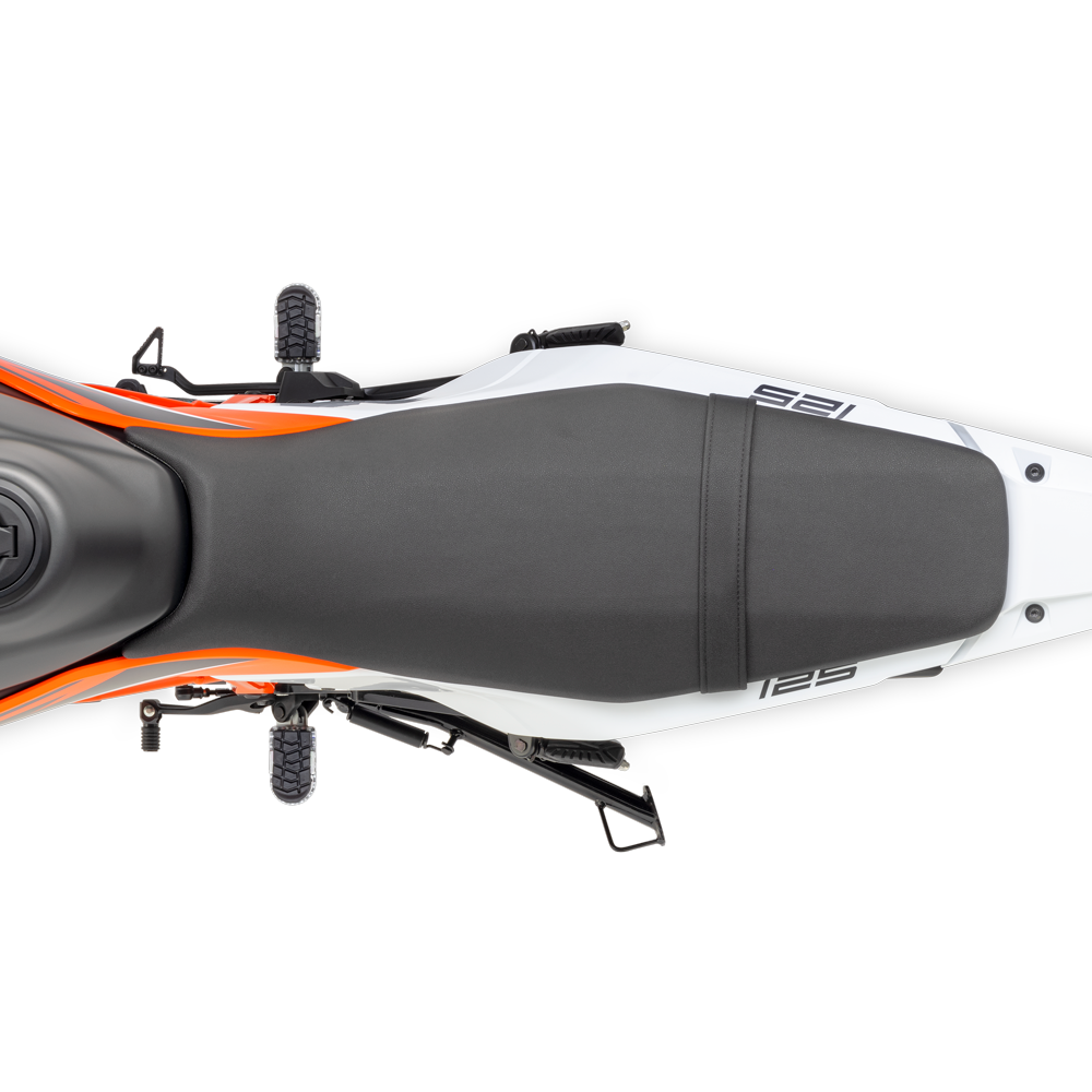 Inspirada en la gama KTM EXC pero con un confort añadido para los desplazamientos o viajes más largos, la KTM 125 ENDURO R tiene un diseño de asiento plano de una sola pieza para facilitar la movilidad a bordo y cuando se está de pie sobre las estriberas.